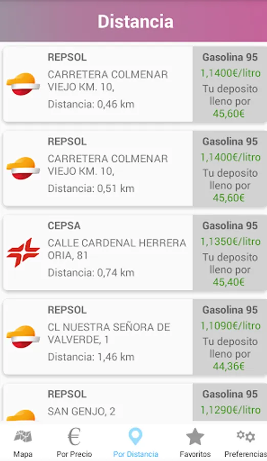 You can setup a custom list with your favourites gas stations to know their fuel prices and distance from your location.