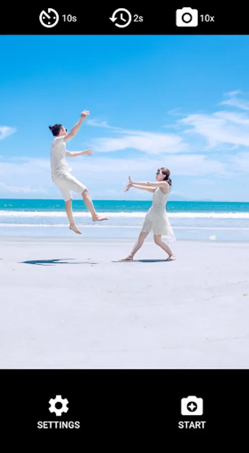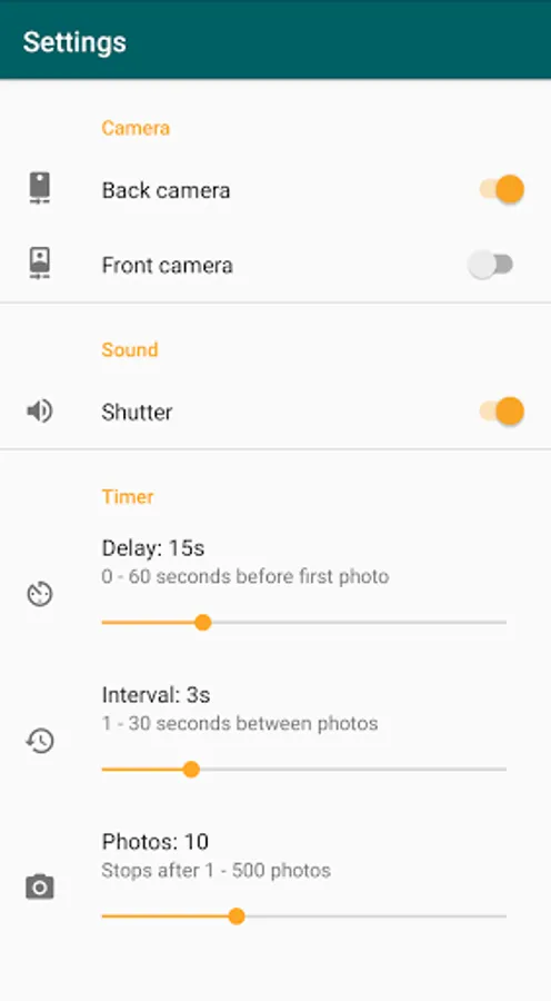 This is a camera app that takes multiple photos in an interval. Simply pick your wanted initial delay, interval, and how many photos you want.