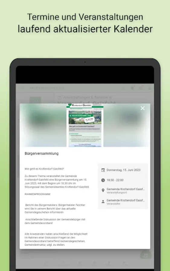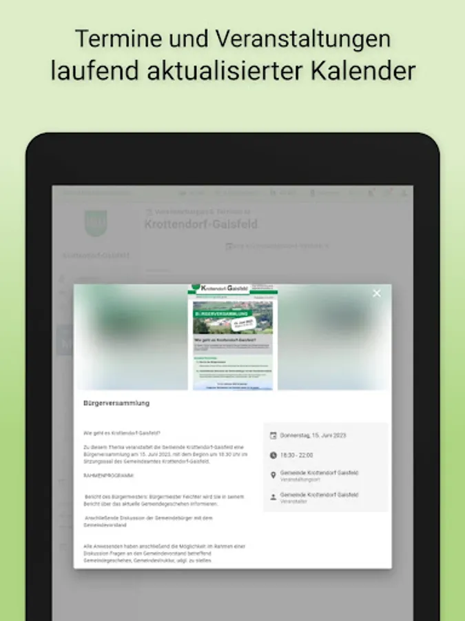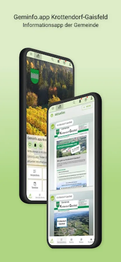 Current and local information on the economy, clubs, direct marketing, etc. in Krottendorf-Gaisfeld is collected and processed via the Geminfo.app. In addition, community news, events and dates can be called up.