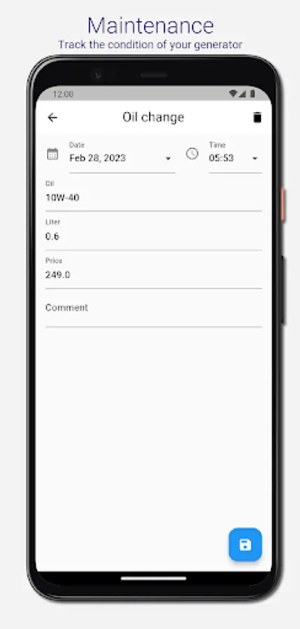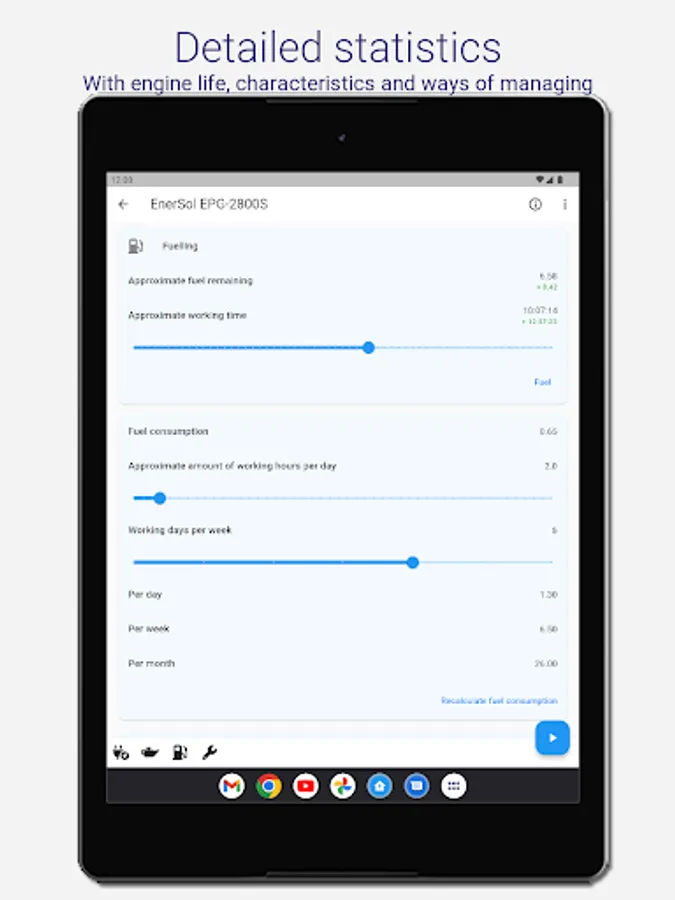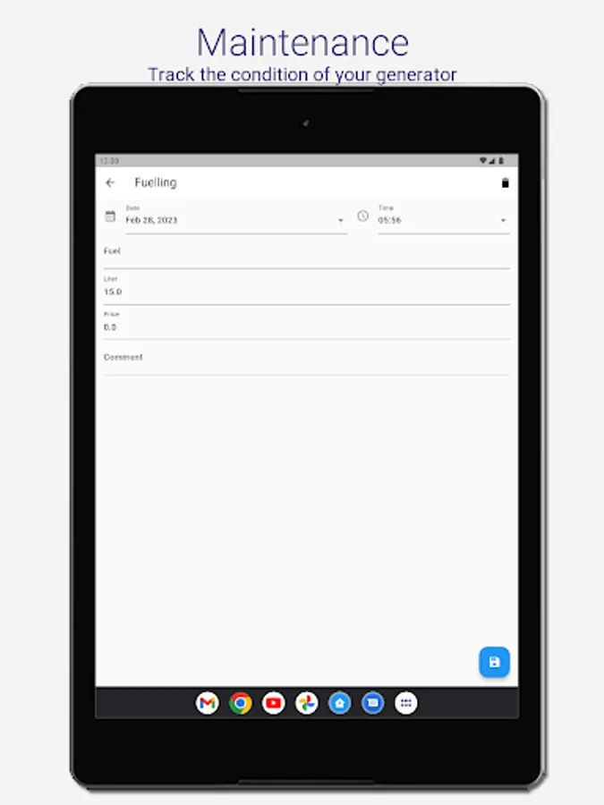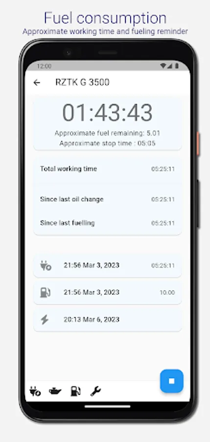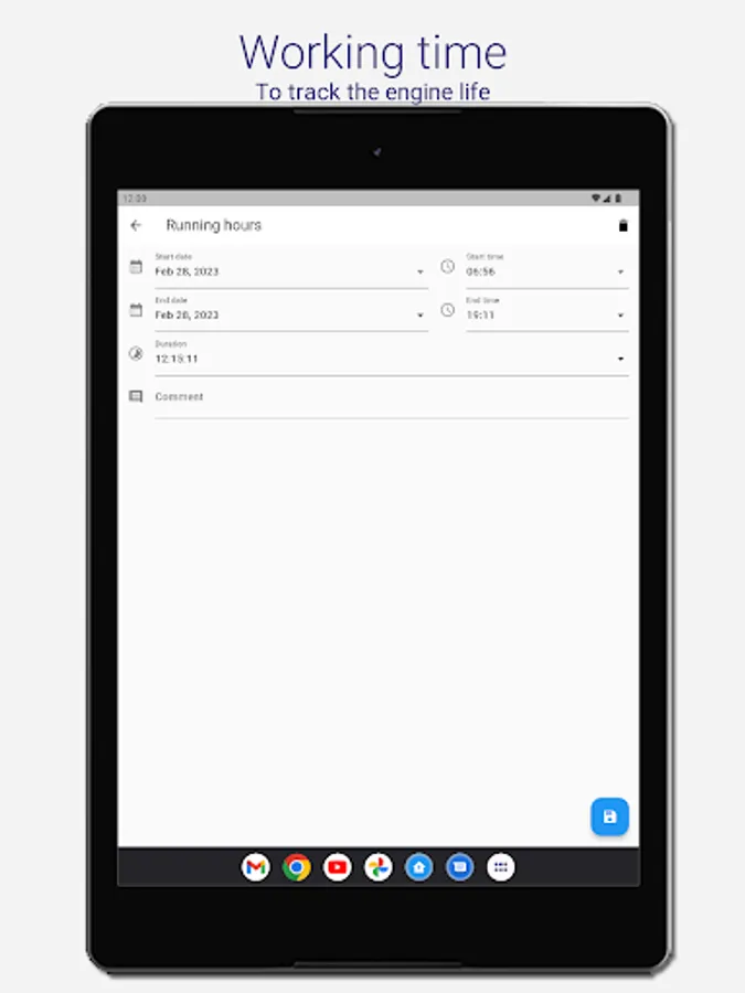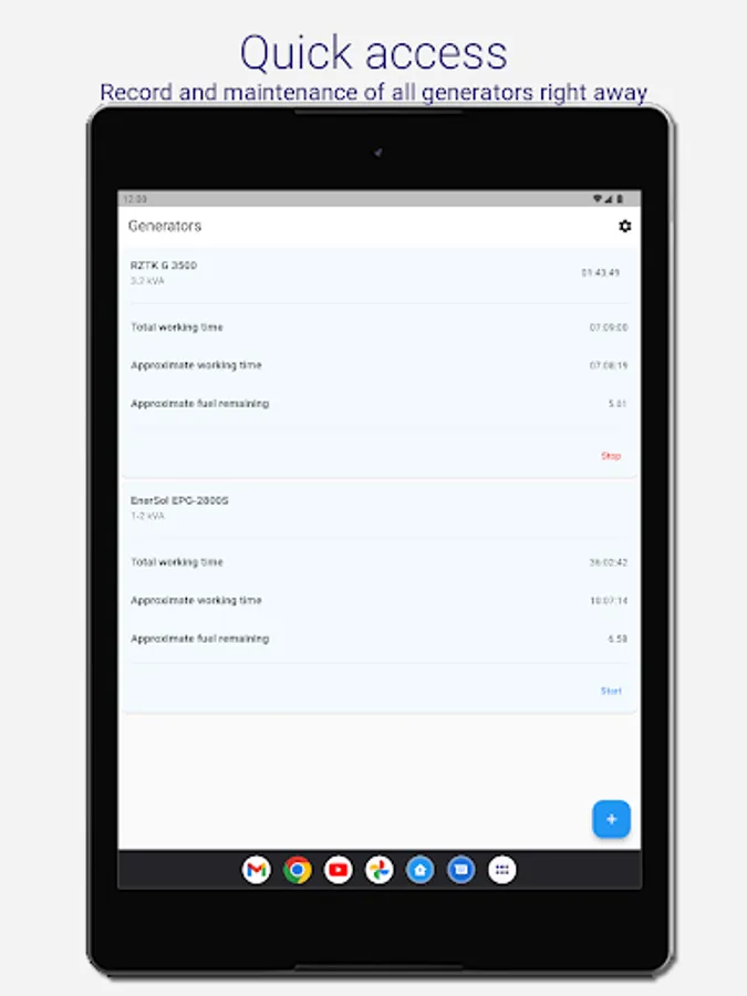 Do you have a generator? Tired of recording its working time? Don't remember last changing oil time? Then this application is going to simplify its service for you. Just imagine a notebook with such a possibility to mark the beginning or end of work with one click.