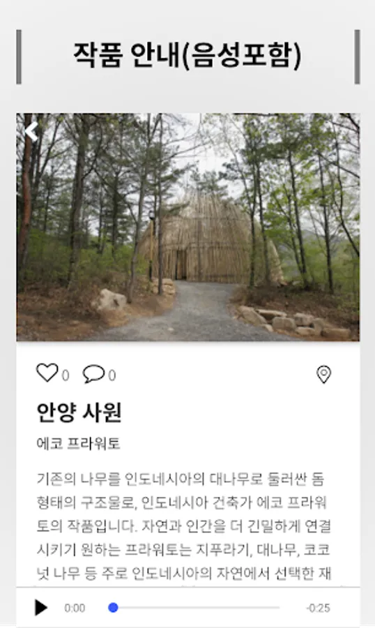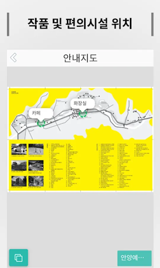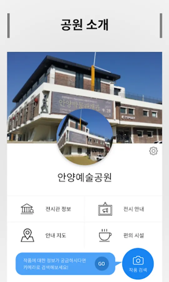 작품에 감춰진 흥미로운 이야기들을 당신에게 전합니다. 주요기능 - 공원소개 : 정보, 전시 안내, 안내지도, 편의시설 소개