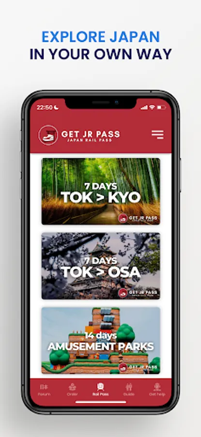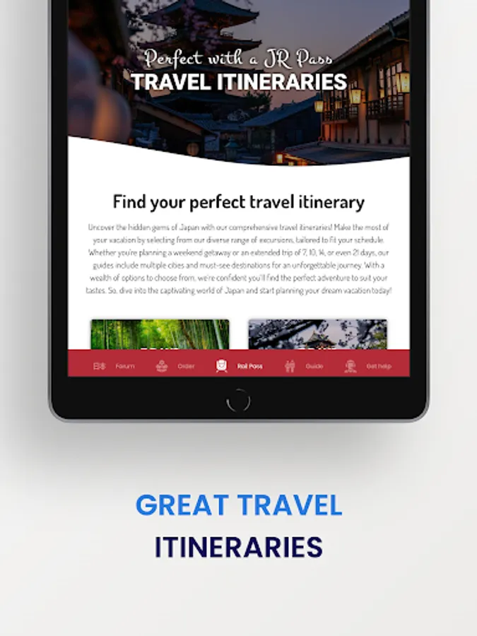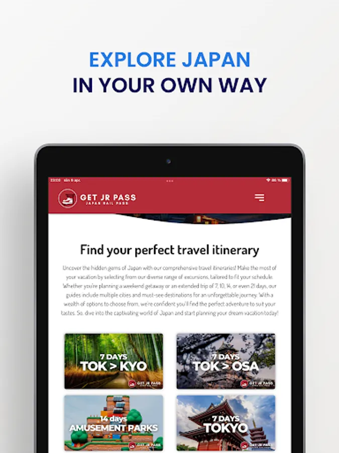 Discover the beautiful country of Japan with help of a Japan Rail Pass and travel across the country in super-speed on Shinkansen bullet trains. While you're at it, enjoy our large and free to use for everyone, travel guide! Download the app today and enjoy tools to fulfil your trip to Japan.