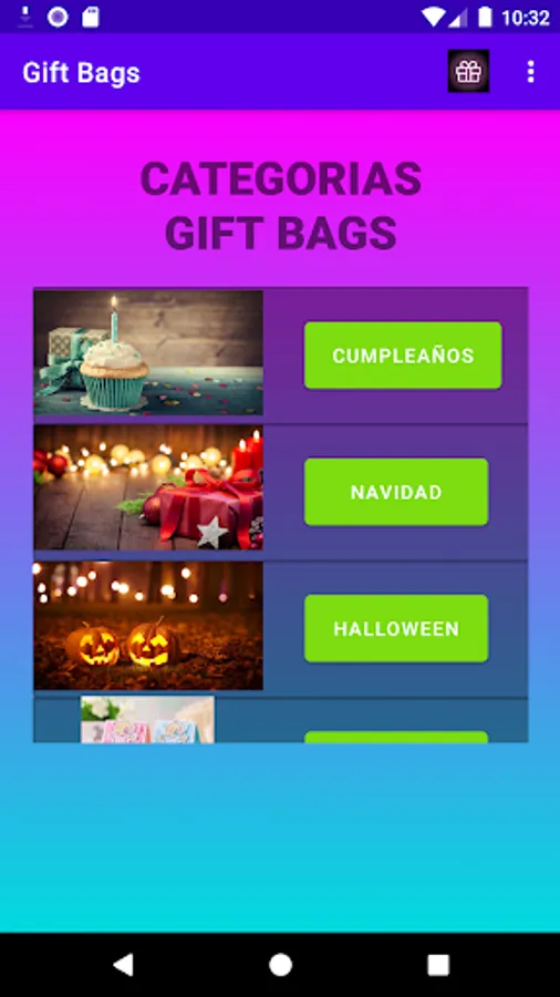 The categories are: Christmas, Halloween, birthday, Valentine's Day, baby shower.