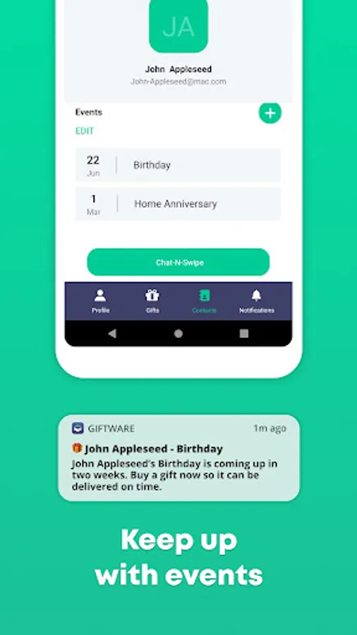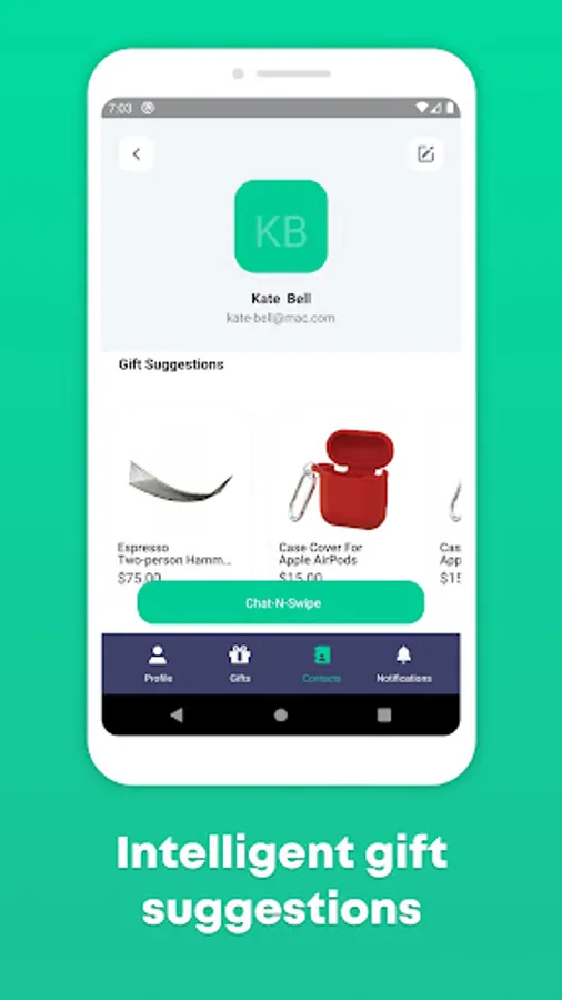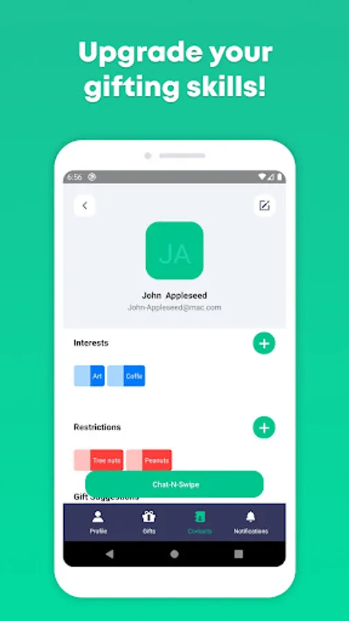If you feel like you don't have enough data send a Chat-N-Swipe survey link. By answering a few basic questions and swiping cards right or left, contacts will provide you enough data to buy the perfect gift. Our intelligent recommendation system will make sure of it.