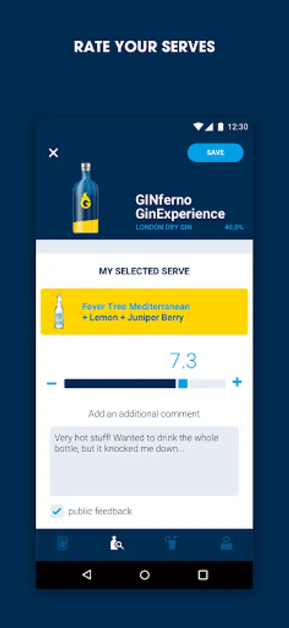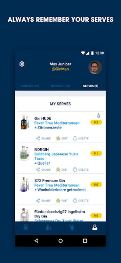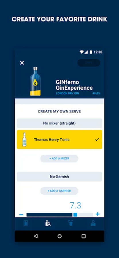 Have a new recipe which isn't in the app yet? Create your own recipe based on over 12,000 gins, 1,200 mixers and 220 garnishes. Rate it, comment on it, and keep it for yourself or share it with friends.