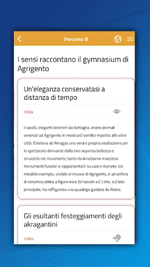 As part of the project, all the Sites are presented with historical-artistic content, related to multisensory journeys. Each of them is connected to each Property and to the territory to which it belongs, in relation to the history and local traditions. Each Site is illustrated by different cultural paths that illustrate the Goods with different multiple degrees of knowledge. The text is also available in English and is accompanied by informative videos, also in LIS.