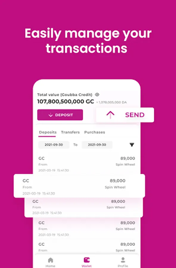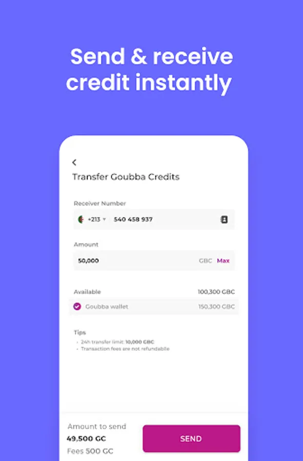 – Deposit, send & receive your Goubba Credits anytime and anywhere.