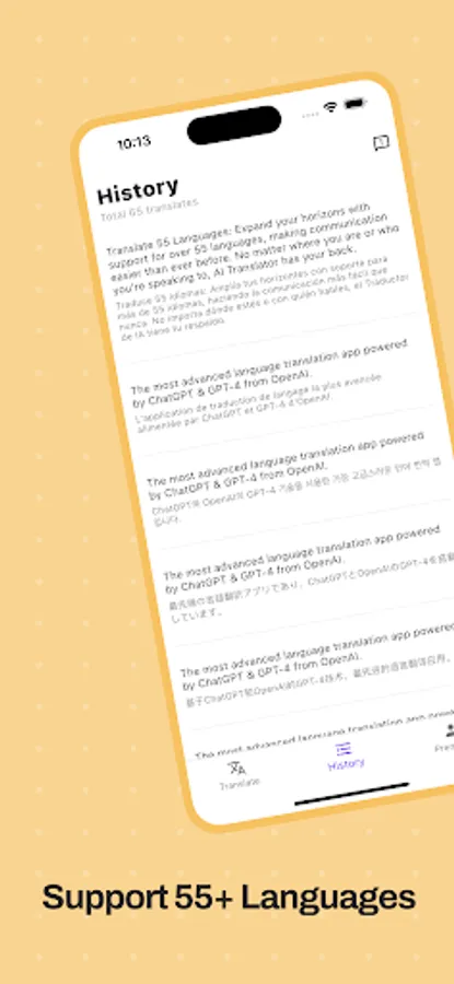 Translate 55 Languages: Expand your horizons with support for over 55 languages, making communication easier than ever before. No matter where you are or who you're speaking to, AI Translator has your back.