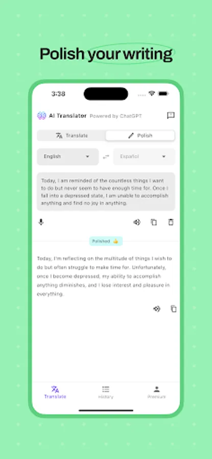 Text Polishing: Enhance your input text with our polishing mode, which refines grammar, style, and clarity to ensure your message is professional and polished.