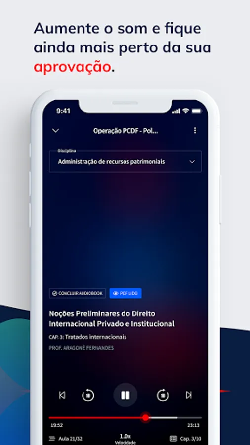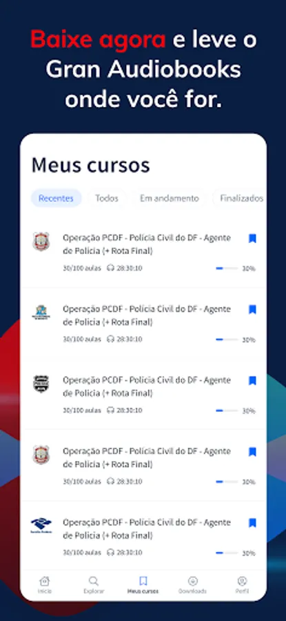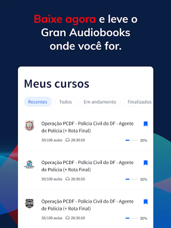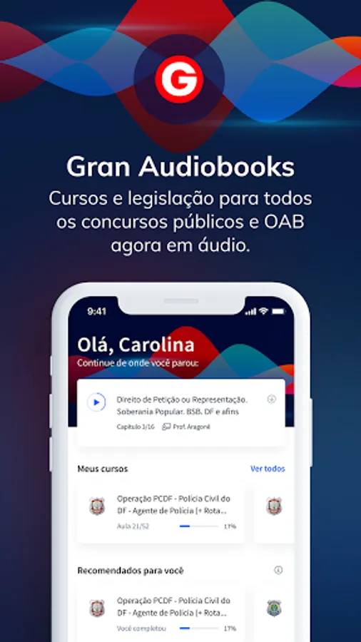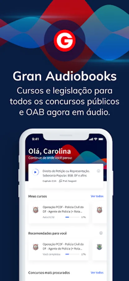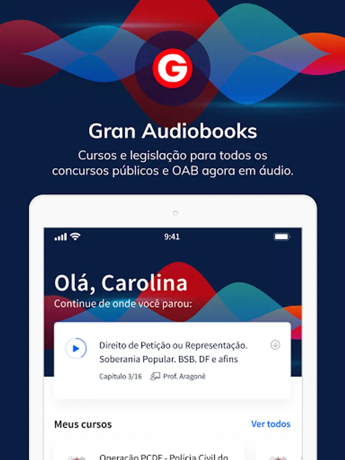 With every detail in mind so that you have the best experience with this cutting edge technology, in the "My Courses" tab of the Gran Audiobook, you will be able to follow when you are in your studies. In addition, an app that makes recommendations that have to do with your way, with your goals, in addition to indicating the most sought contests. If time was your problem, download this application now with the largest collection of audiobooks for contests and OAB in Brazil.