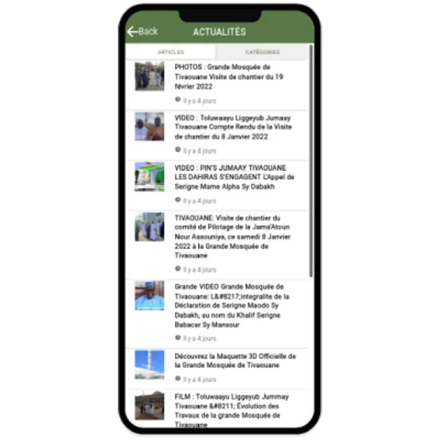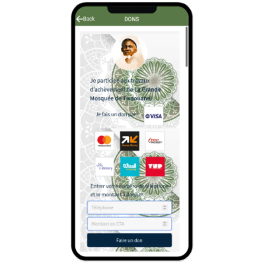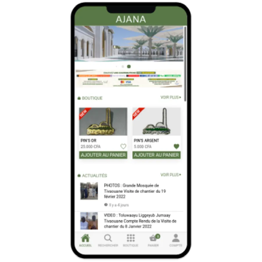 The AJANA application is powered by the Jama'atou Nour Assouniya association. It will allow you to follow all the news of the work of the Great Mosque of Tivaouane and to buy your Pin's online..