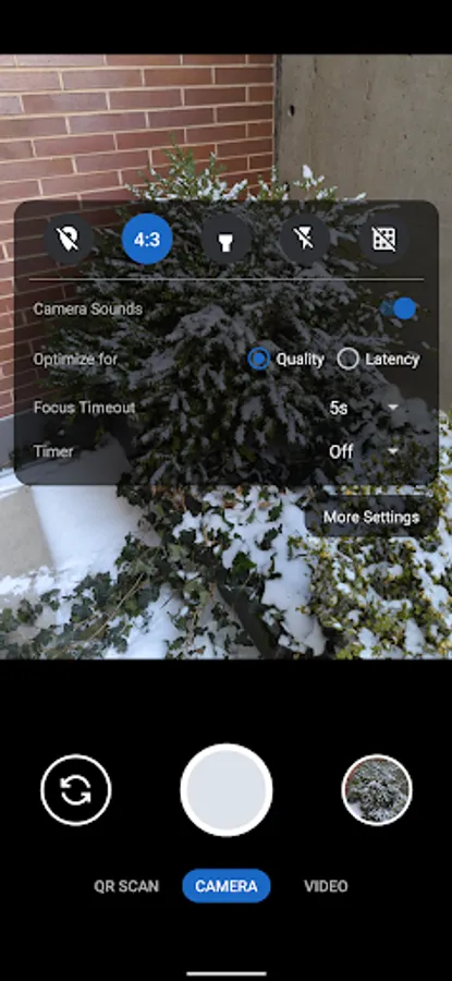 Modes are displayed as tabs at the bottom of the screen. You can switch between modes using the tab interface or by swiping left/right anywhere on the screen. The arrow button at the top opens the settings panel and you can close it by pressing anywhere outside the settings panel. You can also swipe down to open the settings and swipe up to close it. Outside of the QR scanning mode, there's a row of large buttons above the tab bar for switching between the cameras (left), capturing images and starting/stopping video recording (middle) and opening the gallery (right). The volume keys can also be used as an equivalent to pressing the capture button. While recording a video, the gallery button becomes an image capture button for capturing images.