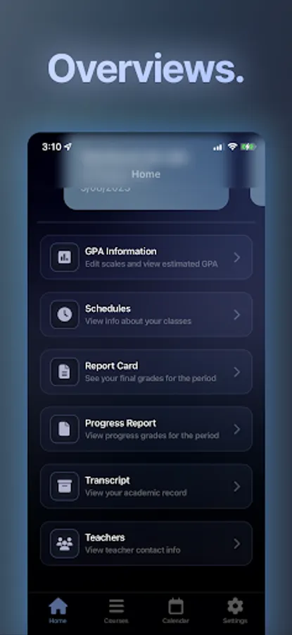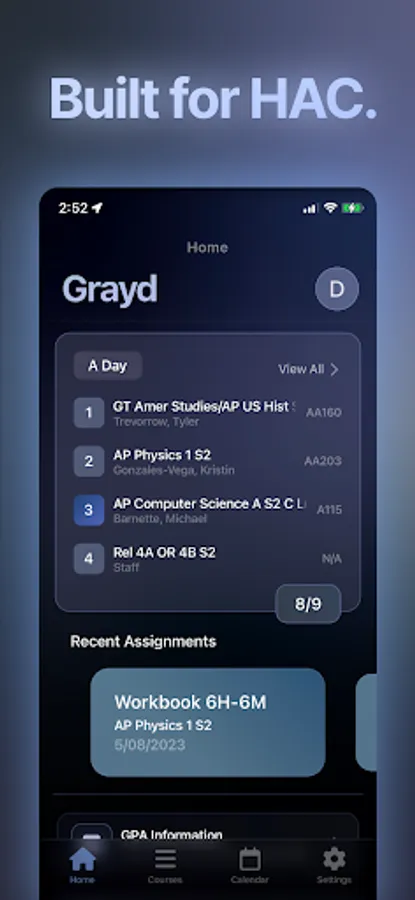 Grayd actively retrieves data from Home Access Center and displays it in a streamlined manner. Schedules, report cards, progress reports, transcripts, and teacher information are easily accessible!
