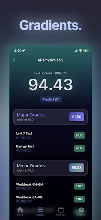Obtain the ability to edit and add assignments to view predicted course averages, GPAs, etc. Multiple courses can be put into Predict Mode at the same time to provide a more comprehensive overview! Beautiful gradients indicate an element is in Predict Mode.