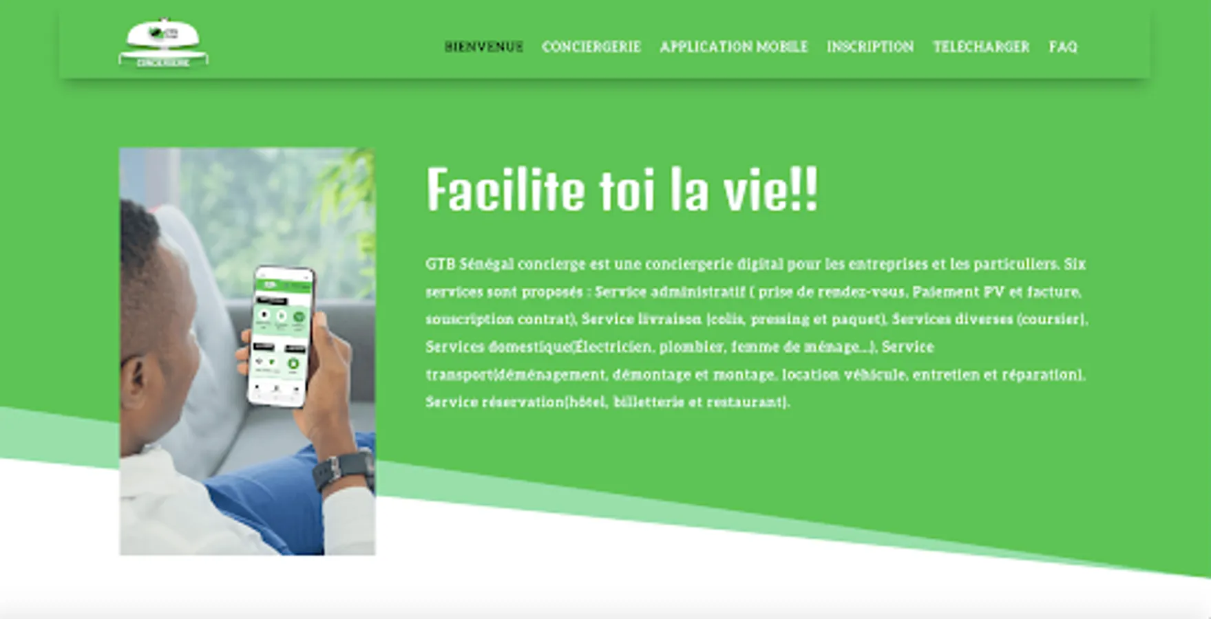 GTB Senegal concierge is a digital concierge for businesses and individuals. Six services are offered: Administrative service (making appointments, Payment of minutes and invoices, contract subscription), Delivery service (parcels, laundry and parcels), Miscellaneous services (courier), Domestic services (Electrician, plumber, cleaning lady. ..), Transport service (moving, dismantling and assembly, vehicle rental, maintenance and repair), Reservation service (hotel, ticket office and restaurant).