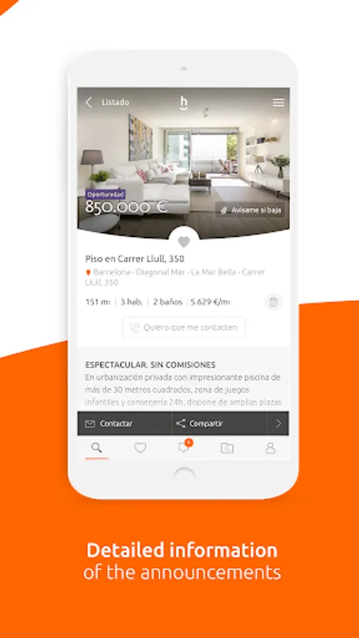 We show you all the available properties in the place you select or in the place where you are. Filter the maximum price, the minimum meters, the number of rooms and more criteria, such as houses with pool, new construction flats, floors with lift... the information is always updated.