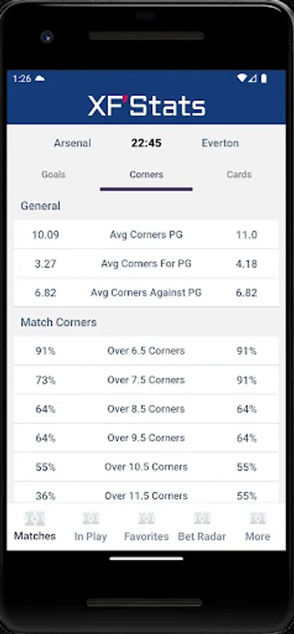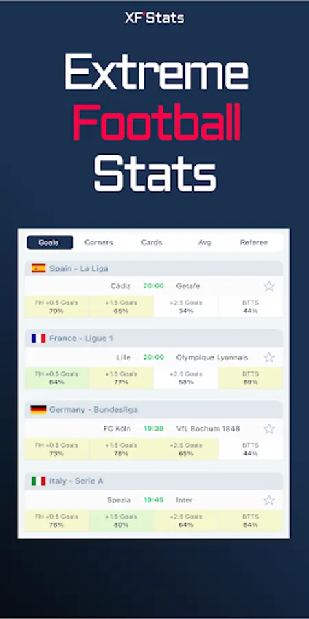 Football statistics for popular markets like both teams to score, over 2.5 goals, corners, cards and many more for 130 leagues worldwide, as well as league tables and predictions.