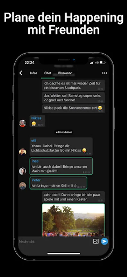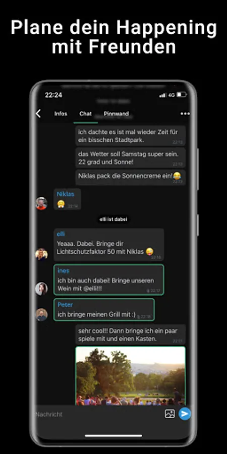 Chat with your friends about what you want to do next weekend directly in the happs app, share photos and ideas and always keep track.