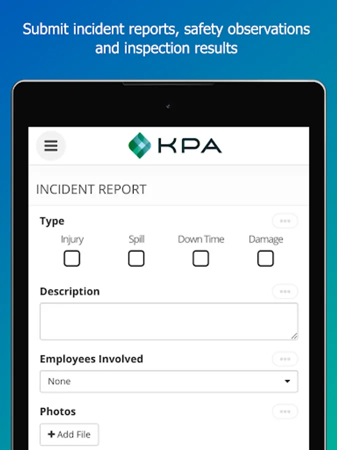 KPA EHS is a powerful yet flexible safety management app for reporting, training, alerts, tasks, inspections and more. Strategically improve safety, regulatory compliance and productivity.