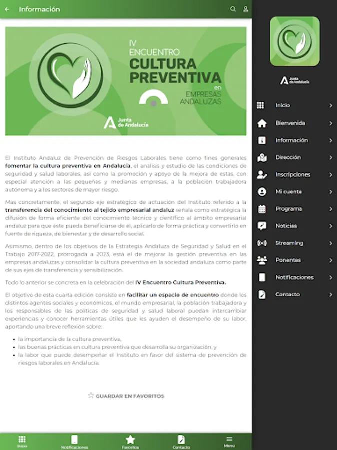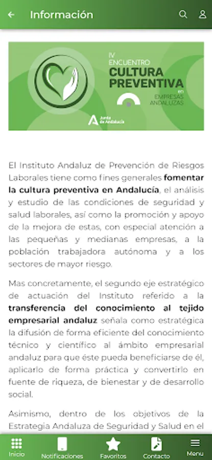 The Andalusian Institute for the Prevention of Occupational Risks has the general purpose of promoting a preventive culture in Andalusia, the analysis and study of occupational health and safety conditions, as well as the promotion and support of their improvement, with special attention to small businesses. and medium-sized companies, the self-employed working population and the sectors most at risk.