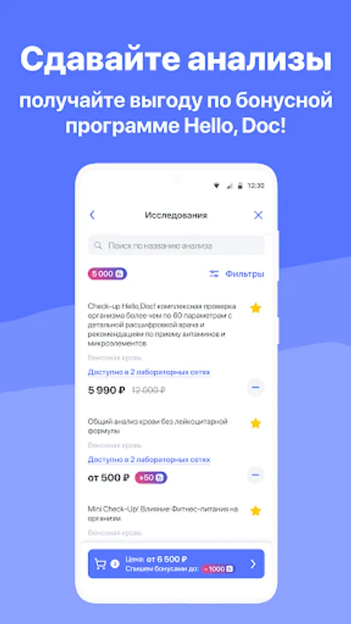 Take tests in leading network laboratories throughout Russia and get a free transcript from a specialist. Store test results from different laboratories in one application, and all bonuses on a single bonus account and pay with them up to 30% of the cost of tests.