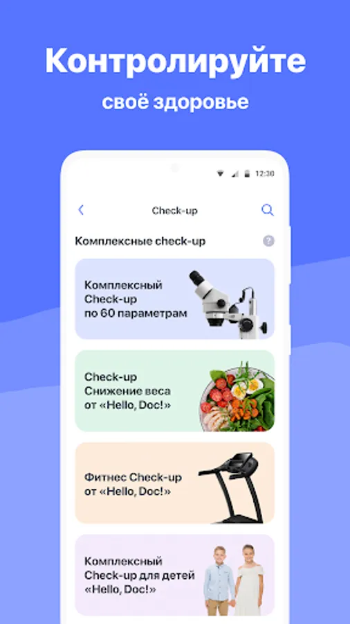 Pass branded Check-Up from Hello, Doc! with 50% discount. Manage chronic diseases, maintain proper vitamin and micronutrient levels, safely lose weight and increase the effectiveness of your fitness training, evaluate key indicators of children's health. Analyzes can be taken close to home, and a detailed transcript of the results will be available in the application.