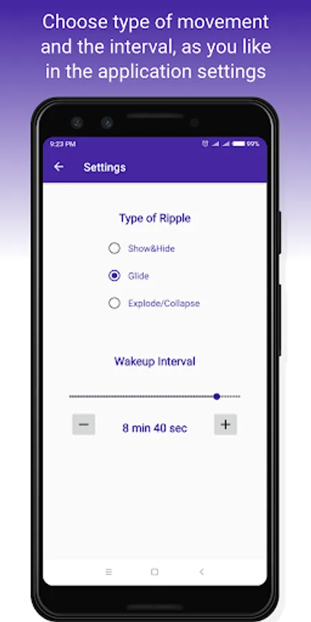 The impact interval on the computer mouse is set in the application settings in a range from 20 seconds to 10 minutes.