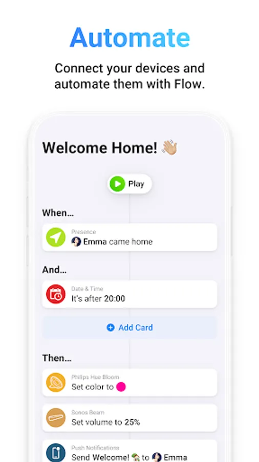 Home automation becomes easier than ever with Homey Flow. Create automations that combine your devices, internet services and music. Anyone can create a Flow with a few taps.