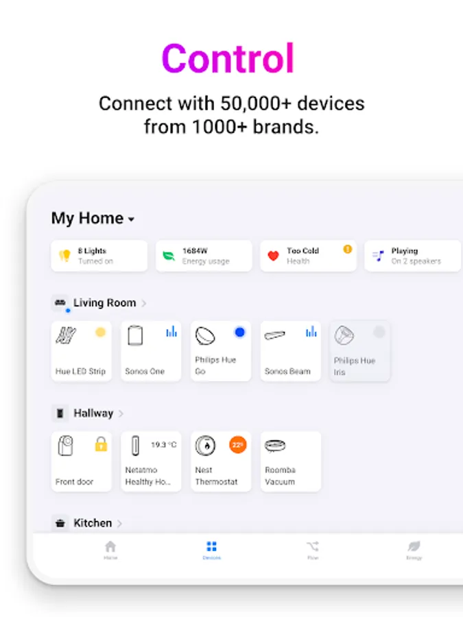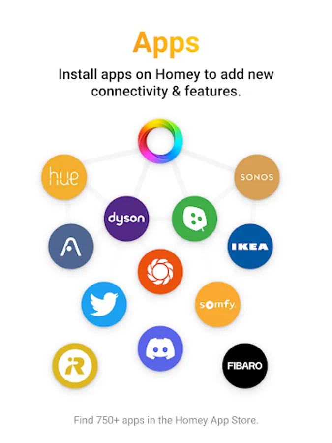 Homey connects more than 50.000 smart devices from over 1000 brands. Make them work together in the way you want. Homey features great-looking controls for all devices, no matter the brand. Make it a joy to play with your smart home.