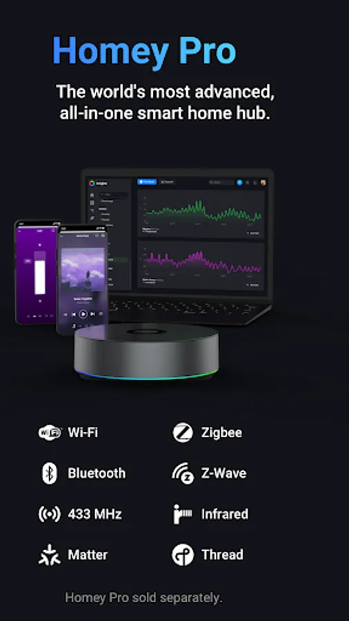 Creating a better smart home has never been easier. Log in, create a home and connect your devices – for free! Cloud-connected devices can be added directly to the Homey app, without the need of a hub. To connect devices using Zigbee, Z-Wave, BLE, 433MHz, Infrared or other local technologies, you can either link Homey Bridge or use Homey Pro.
