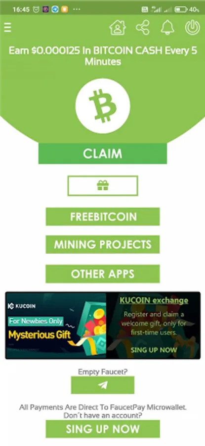 In this application earn BItcoin Cash for free every 5 minutes with direct payments to FaucetPay.