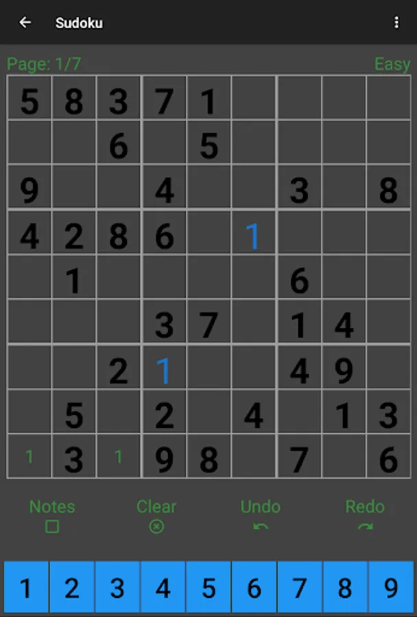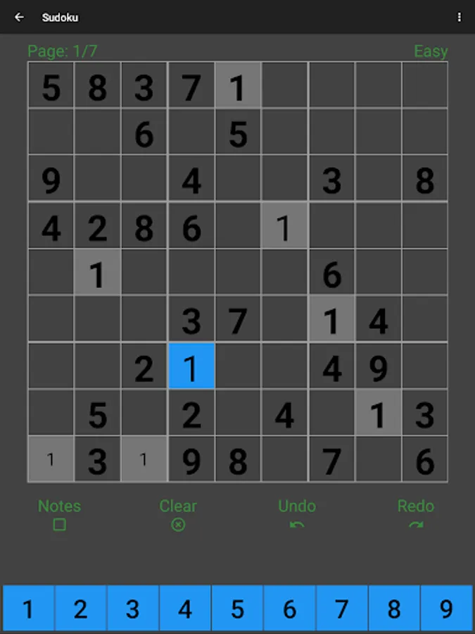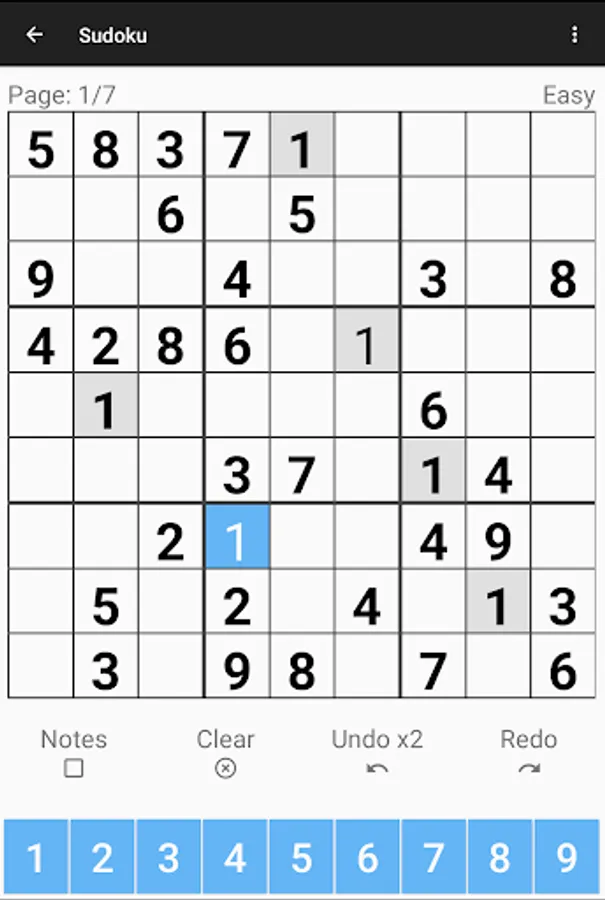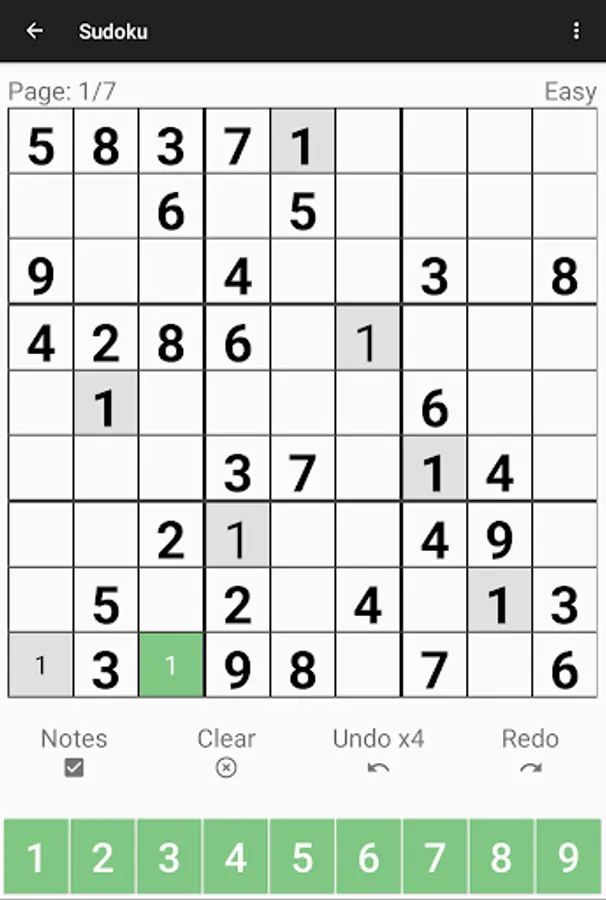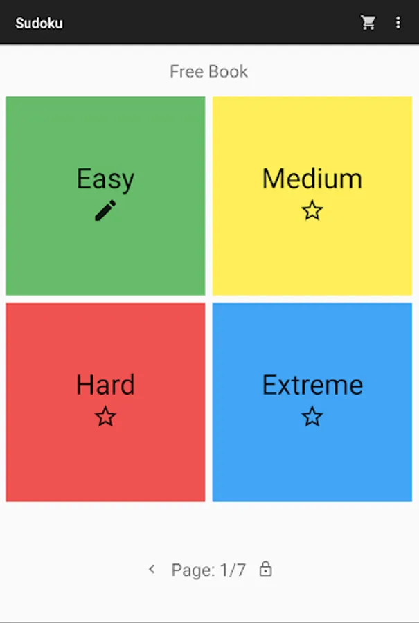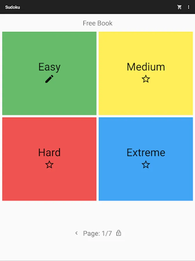 Sudoku puzzles are organized into "books" with four puzzles of varying difficulty on each page, from easy to extreme. After solving at least one puzzle on a page, the next page is unlocked.