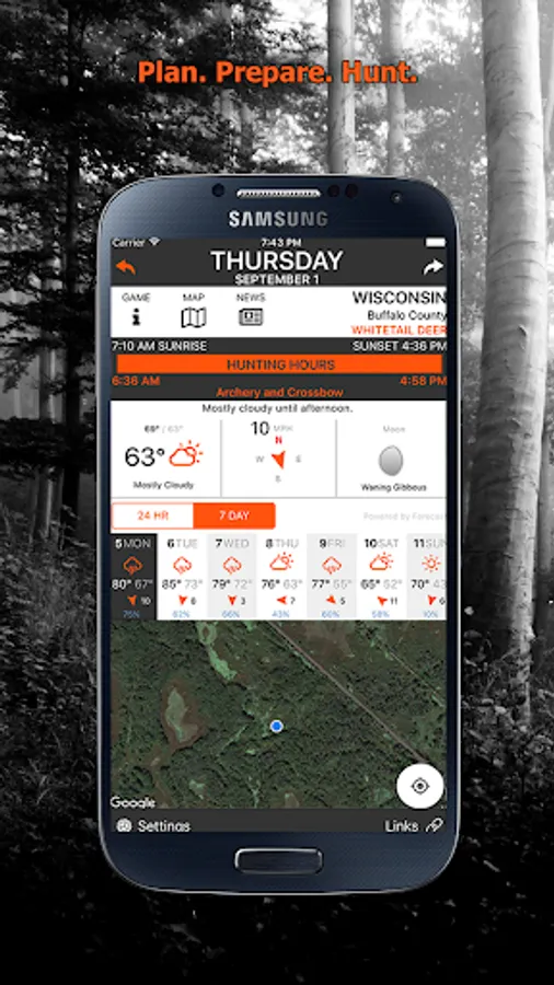 - View hourly weather conditions including wind, weather, temperature and chance of precipitation for today, and the next 7 days, to plan your hunt