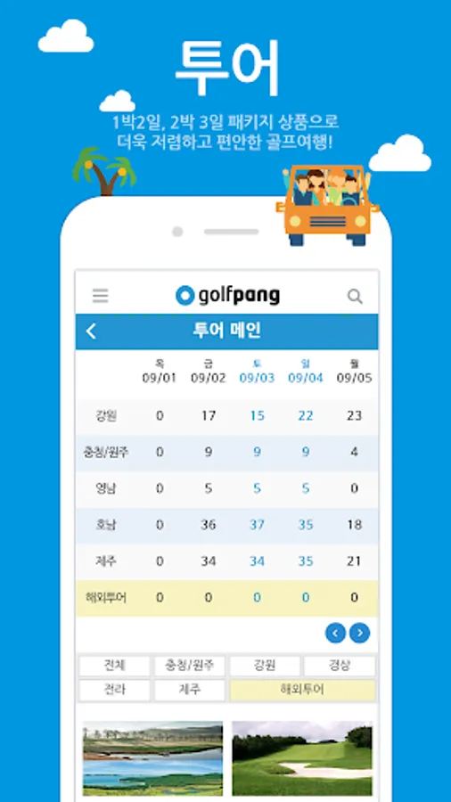 Gangwon, Chungcheong, Yeongnam, Honam, Jeju, etc. You can use golf packages for 1 night and 2 days nationwide and overseas golf tours with good green fees.