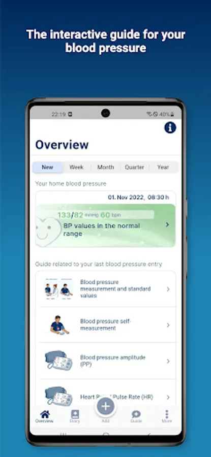 Thanks to a professional library, you will get direct personalized feedback on your blood pressure in the form of a digital guide. You will be informed about different forms of hypertension, causes, risk factors and also about drug-free alternatives for lowering blood pressure.