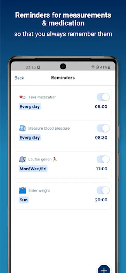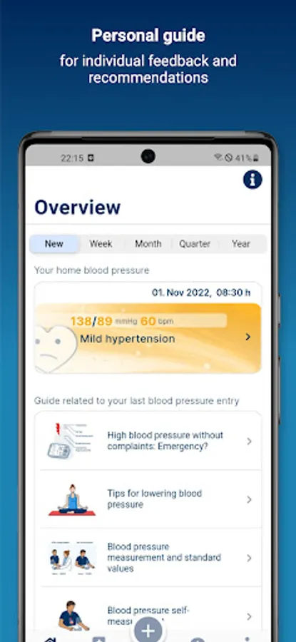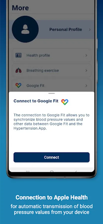 You can enter and document your self-measured blood pressure values and the measurements taken in your doctor's office, including the 24-hour ambulatory measurement, and also synchronize it with Google Fit. You will receive charts, statistics as well as individual feedback on your values. In addition, you can perform guided breathing exercises within the app as an effective immediate measure for lowering blood pressure, relaxation and stress management.
