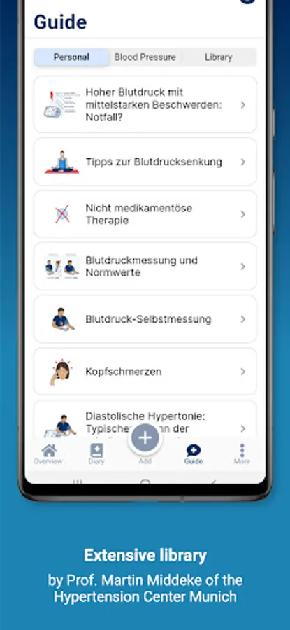 Hypertension Care offers a digital guide, based on in-depth knowledge about blood pressure. The app combines diary entries for blood pressure and other vital parameters with an extensive blood pressure library and provides personalized advice and evaluations.