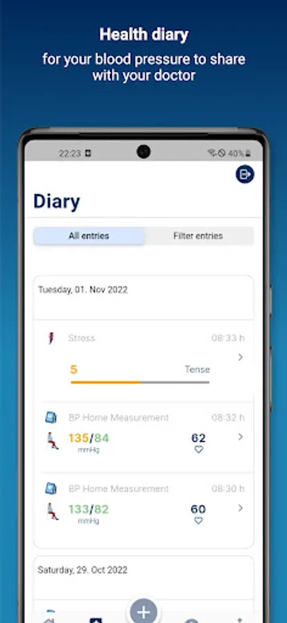 In your personal health diary, you can enter blood pressure values, as well as information on your symptoms, stress levels, weight, pulse wave analysis and medication. Blood pressure and weight values can be synced directly with Google Fit.