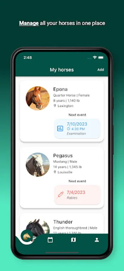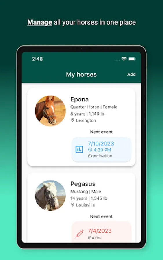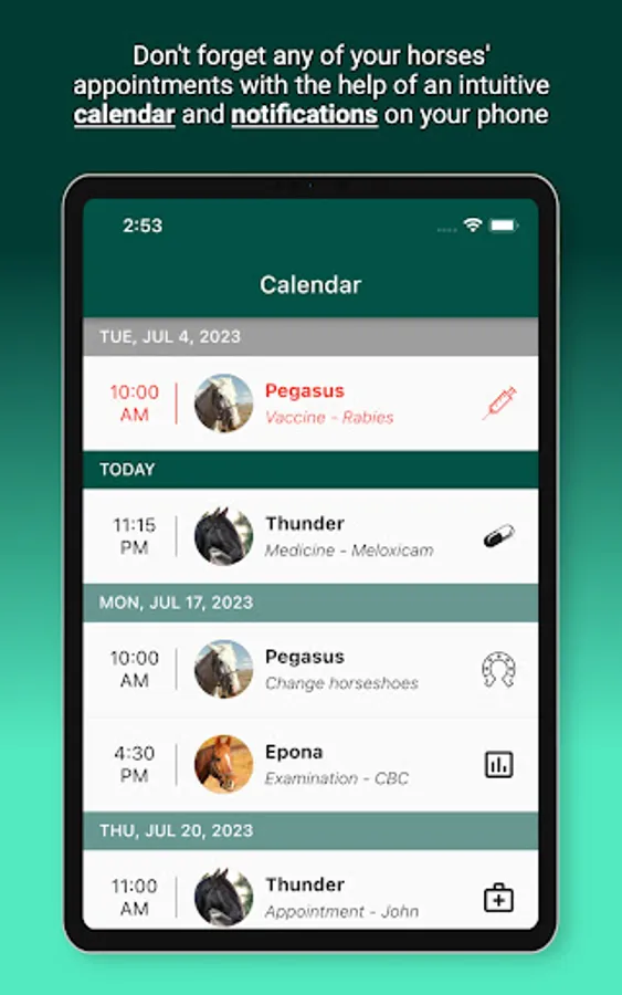 - Receive notifications on your phone about upcoming appointments for each of your horses