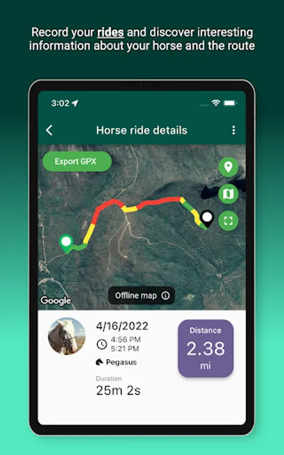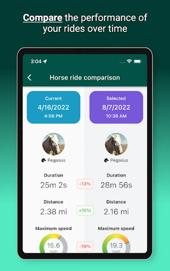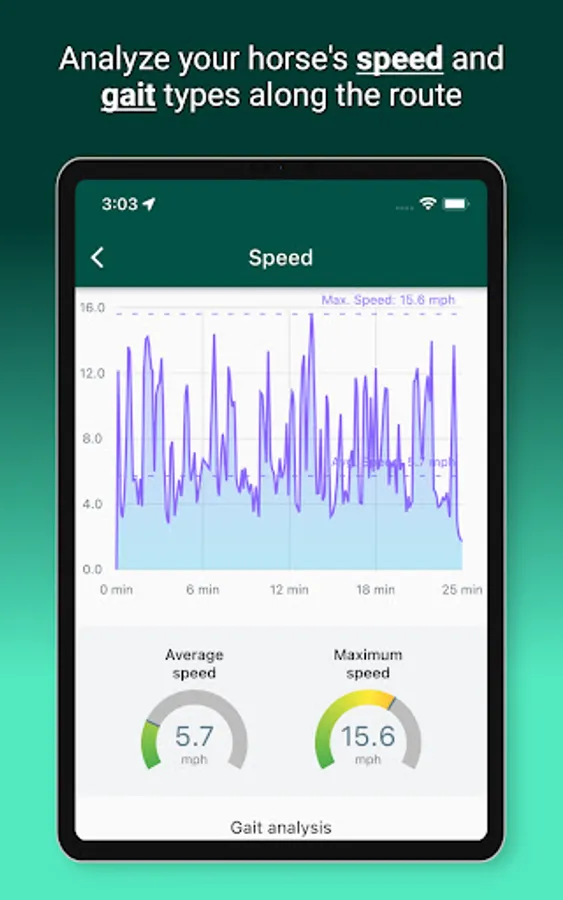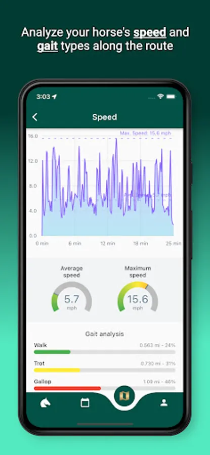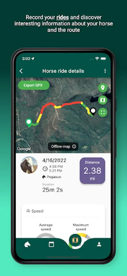 - Speed ​​analysis: find out the maximum and average speed of your horse during the ride and see through graph and map the speed variations along the route