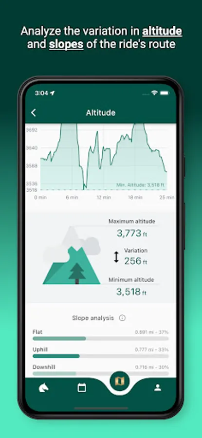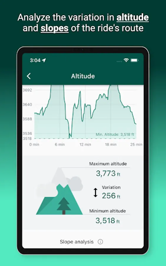 - Altitude analysis: find out the maximum and minimum altitudes of your ride, as well as the distance on each terrain slope (flat / uphill / downhill)