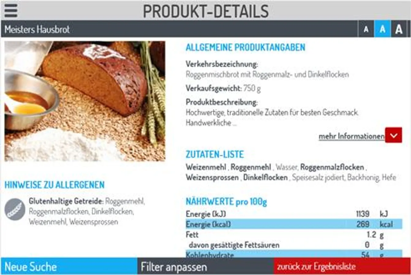 Starting from the selection of possible incompatibilities, allergies, etc. BackBüro® provides mobile numerous over- and detail views to inform target-oriented to the consumer.