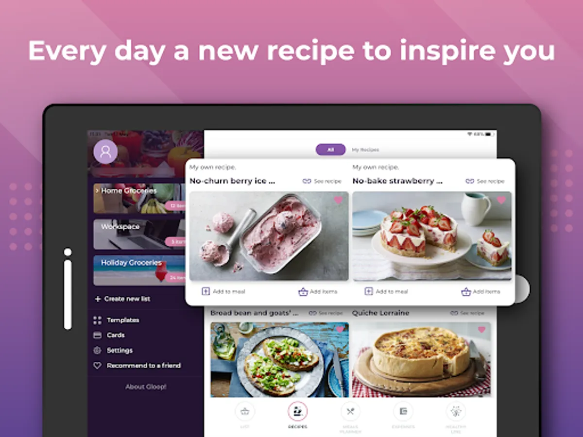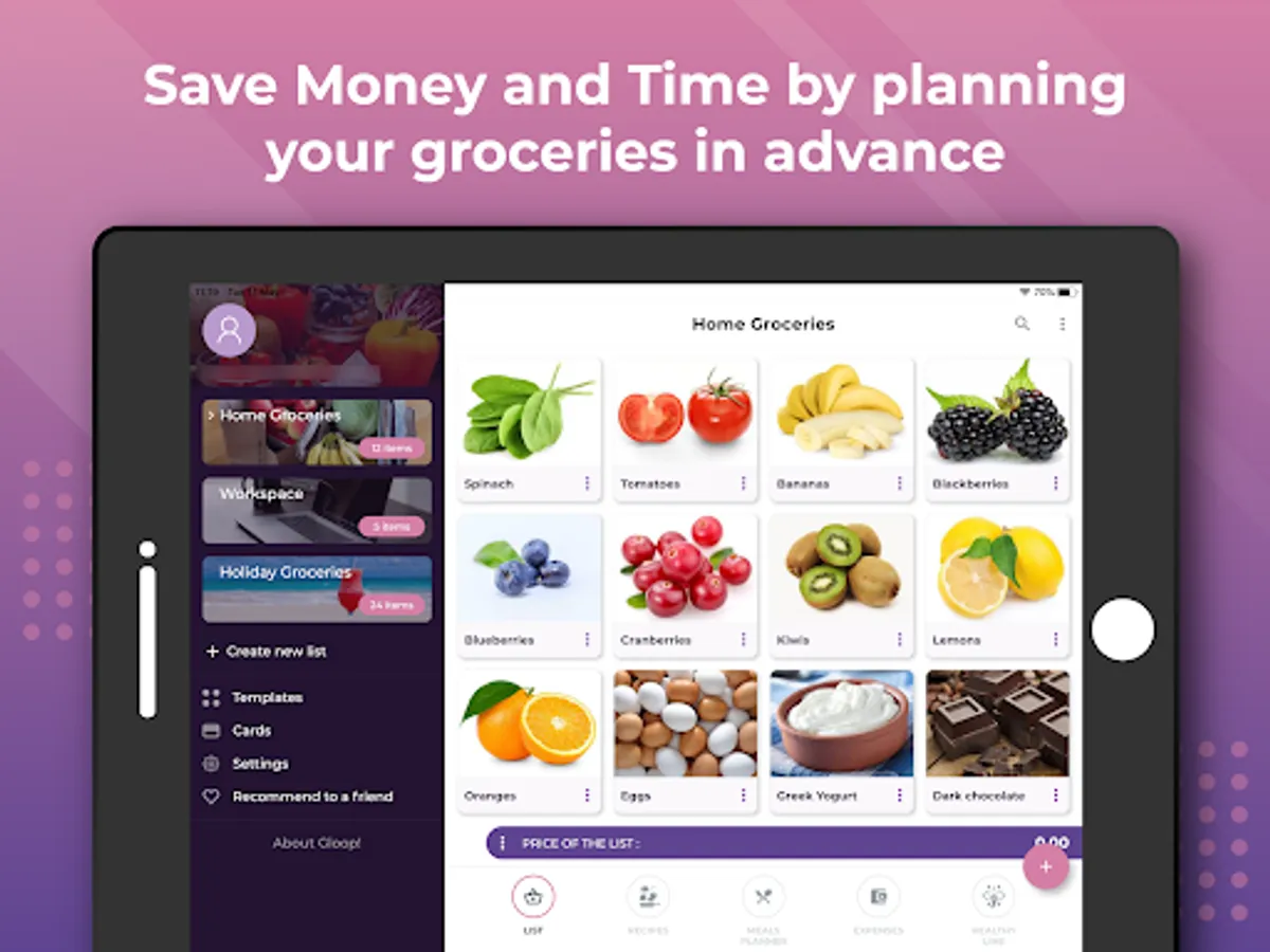 Meet Gloop, which gives you just that and more. Such as an advanced expense grocery shopping list calculator to know your shopping list price total, as well as daily recipe recommendations for your healthy lifestyle and eating. Gloop makes the grocery organization of your eating and household simpler and customized.