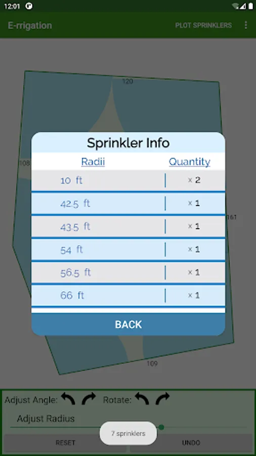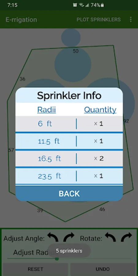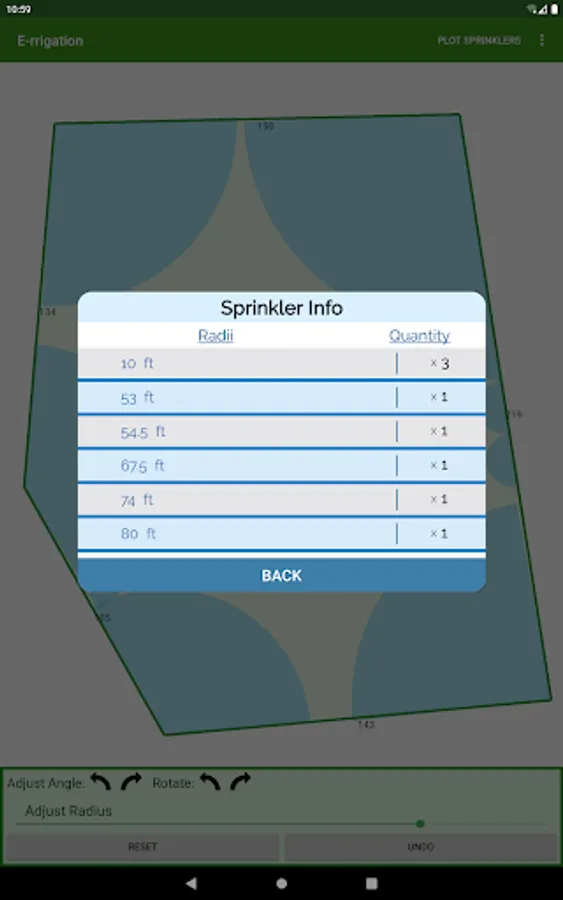 - Sprinkler Info: Have a lot of sprinklers of various sizes? Well, in the app menu, E-rrigation provides a list of sprinklers by their radii and quantity.