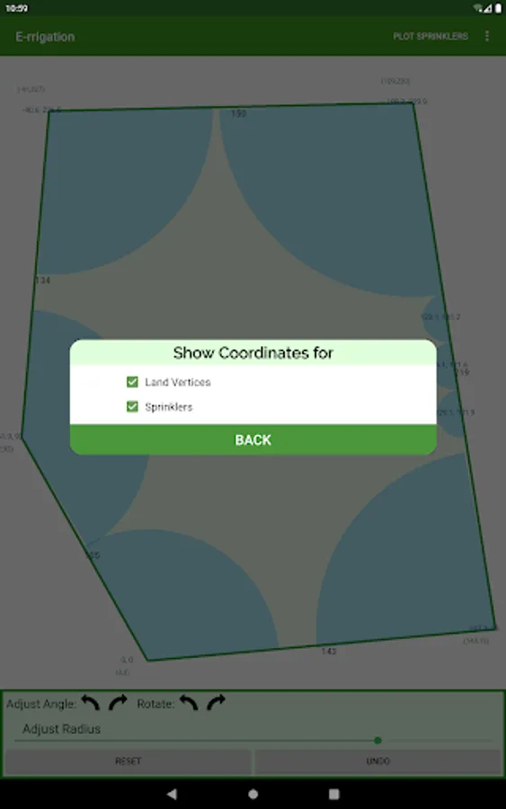 - Sprinkler Coordinates: Finalized your design plan and ready to get it installed? E-rrigation provides the coordinates of all sprinklers (in feet) in relation to the land area. Simply go to “Measurements” under the menu.