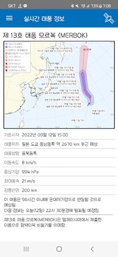 It shows real-time typhoon information based on data provided by the Korea Meteorological Administration.
