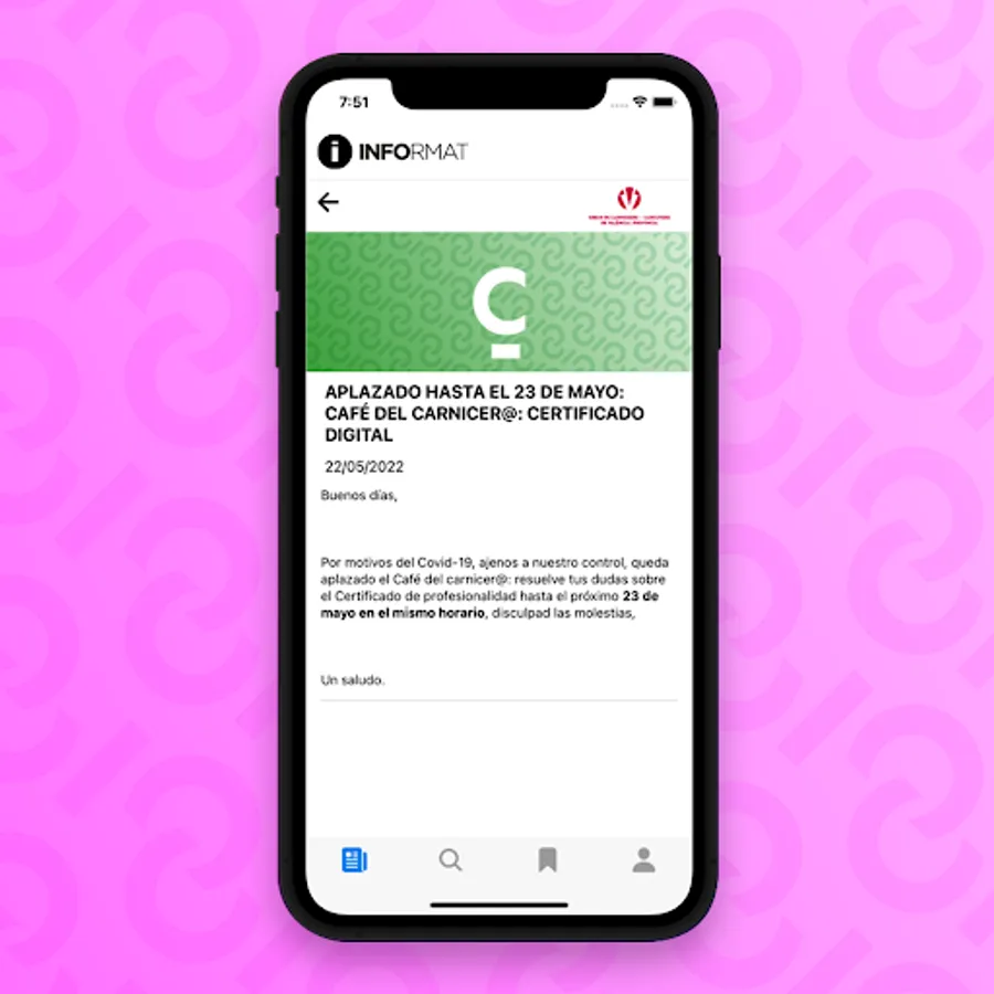 Con esta APP estarás siempre en primera línea, recibiendo información actualizada y relevante directamente en tu móvil. Olvídate de perder tiempo buscando entre correos electrónicos o mensajería directa. INFORMAT te notificará al instante de las últimas novedades y podrás guardarlas y localizarlas con facilidad.