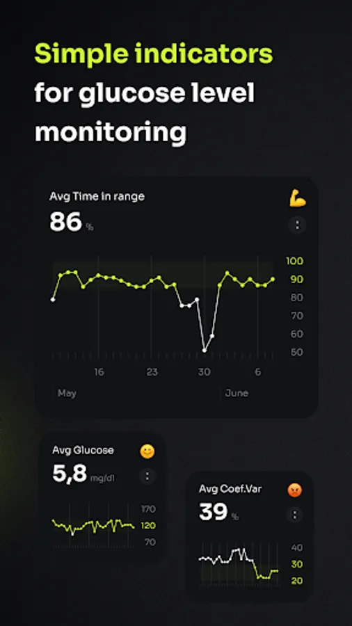 • Time in range. The app analyzes all glucose values by the chosen period, counts those within the range 70-180 mg/dL (or your personal range), and calculates the relative result in percentage. The higher it is, the better your condition is.