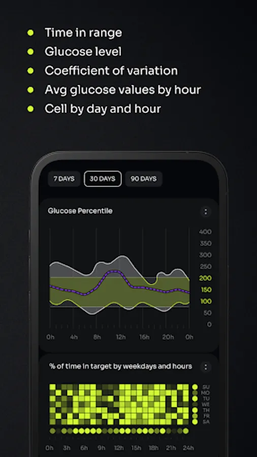 • Cell by day and hour. Monitor your weekly TIR patterns to compare the highest and lowest levels you reach and interpret the data for getting healthy insights.