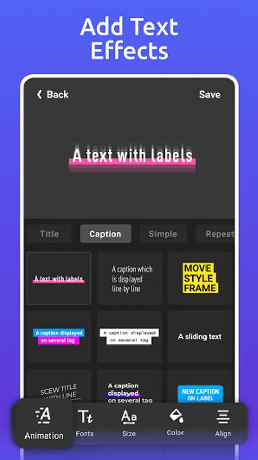 - Add text on photo with animation from categories: Title, Caption, Minimal.